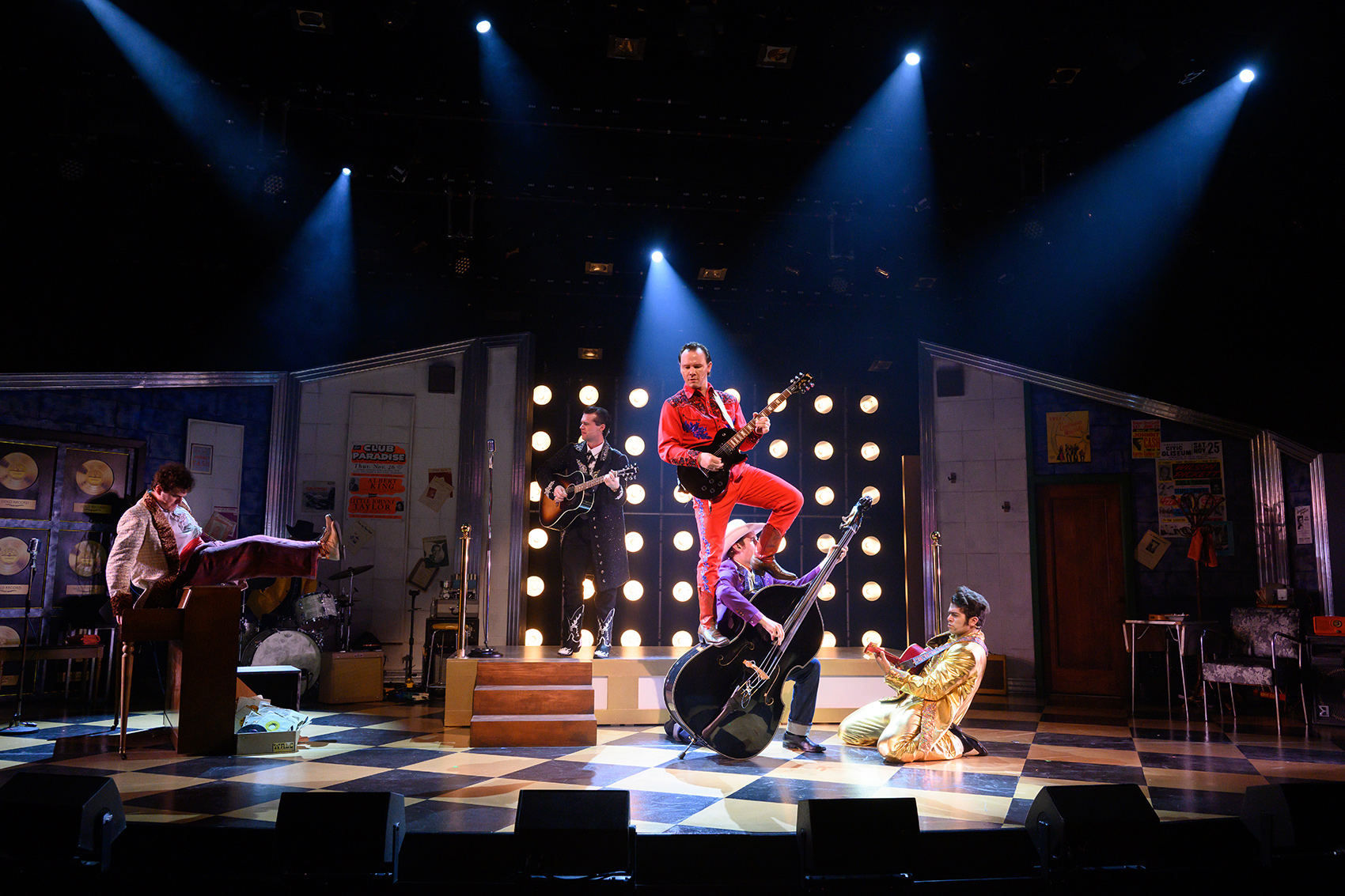 Distribution de Million Dollar Quartet (2025). Mise en scène : Adam Brazier. Costumes et décors : William Layton. Lumières : Davida Tkach. Photo : Louise Vessey.